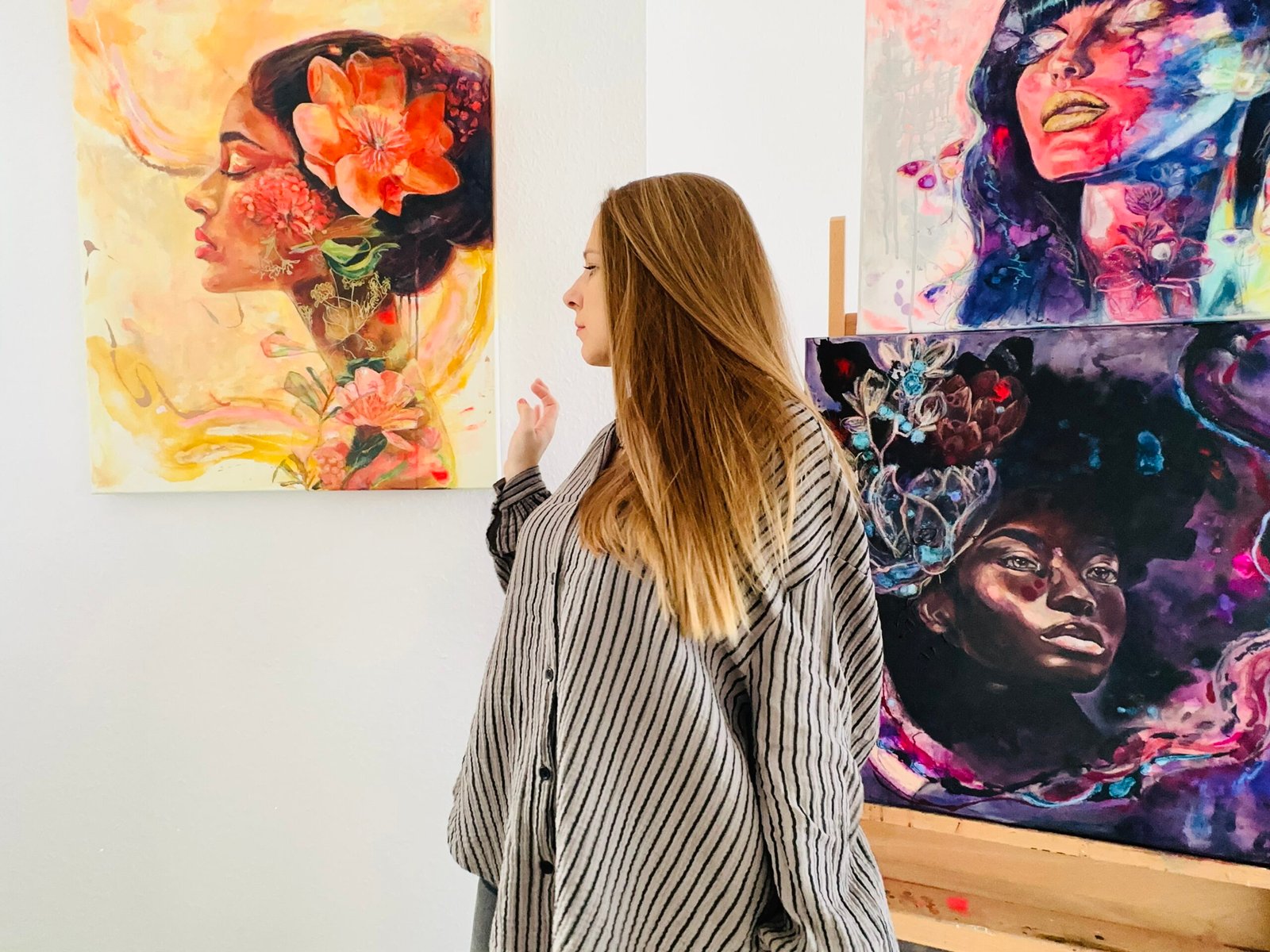 She builds her paintings like memories: layered, luminous, and fearless in truth. Working in mixed media and oils, she merges realism and abstraction, layering ink, acrylic, metallics, and texture into expressive portraits of women. Each piece is a choreography of movement and emotion, where color becomes language and energy turns into form.