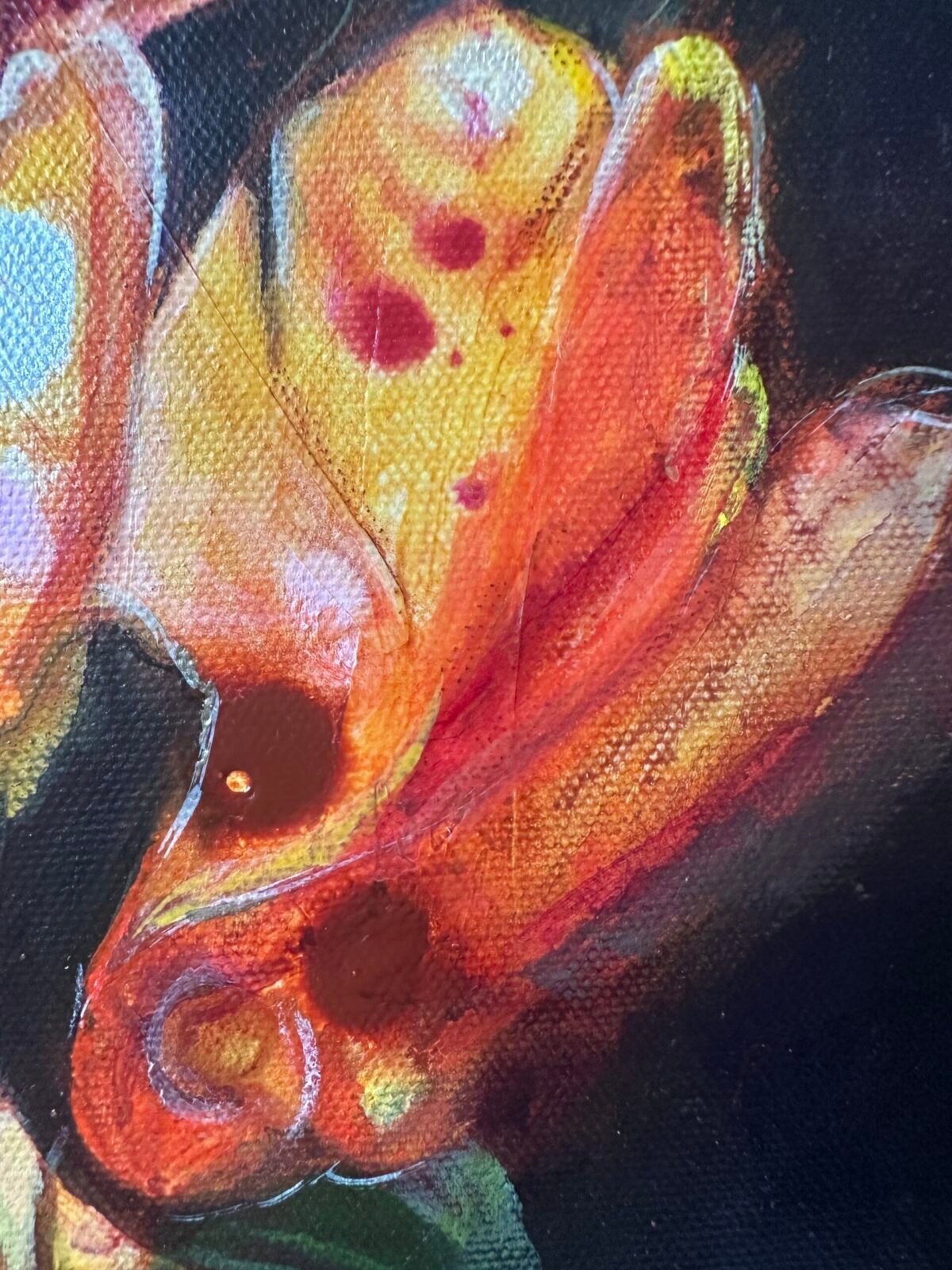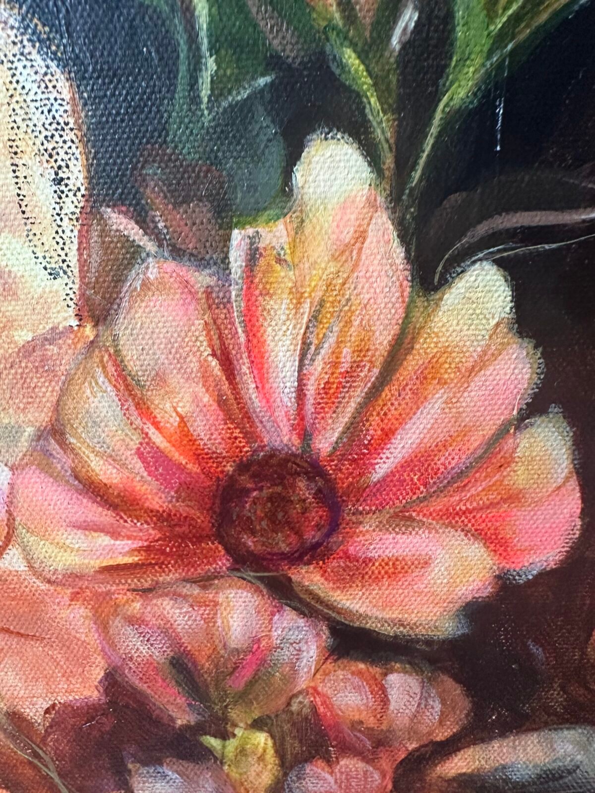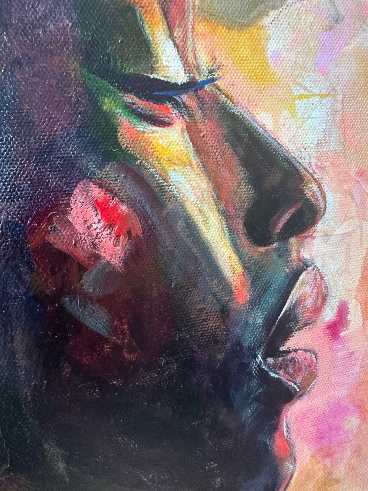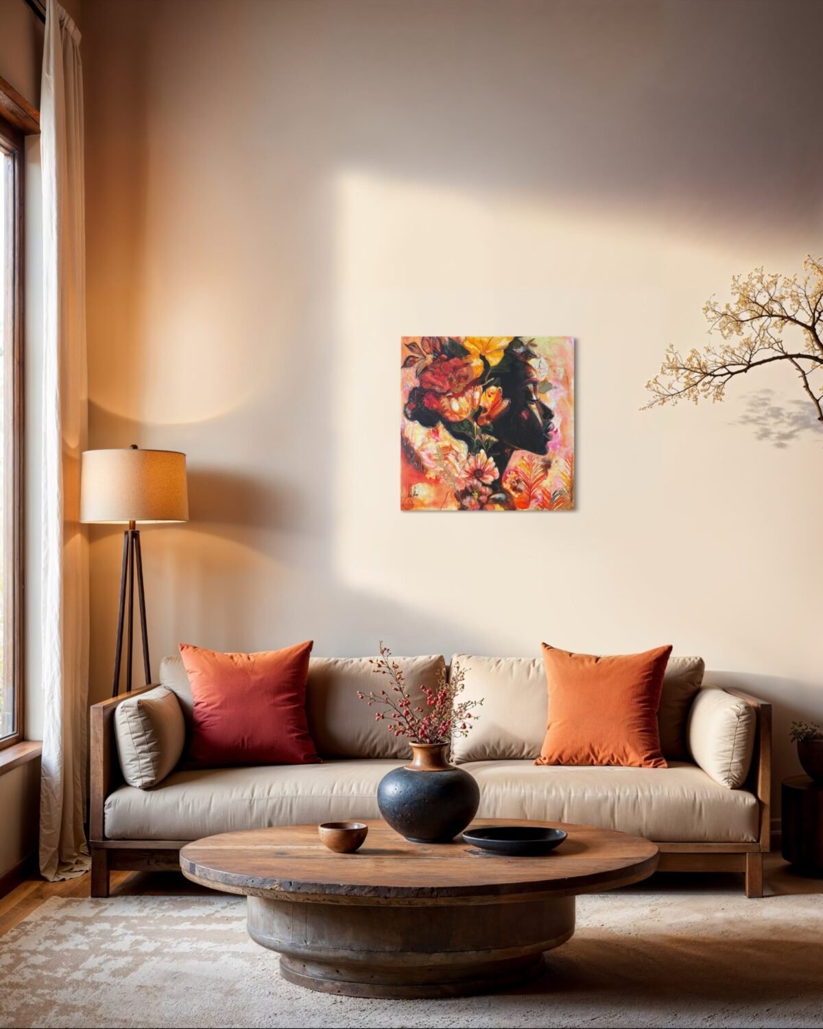 This portrait explores the quiet power of inner conviction — the moment when thought becomes foundation. Floral forms emerge as extensions of the mind, suggesting growth that begins inward and moves steadily outward.